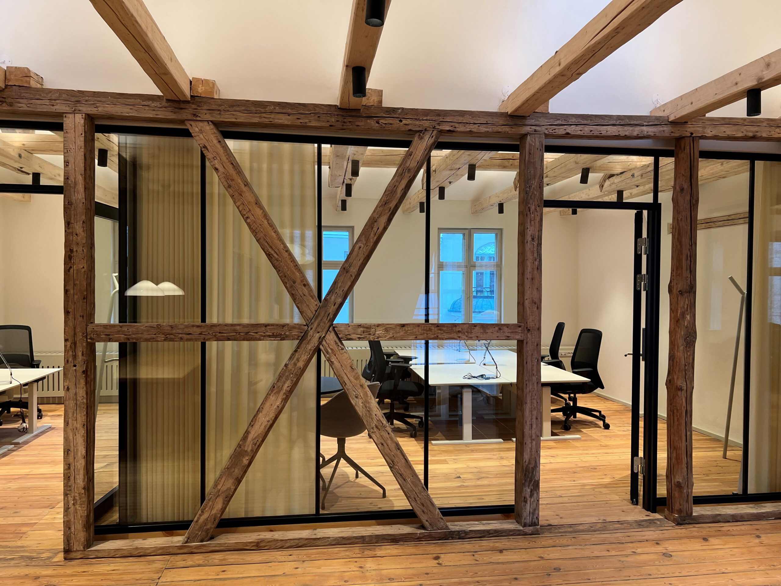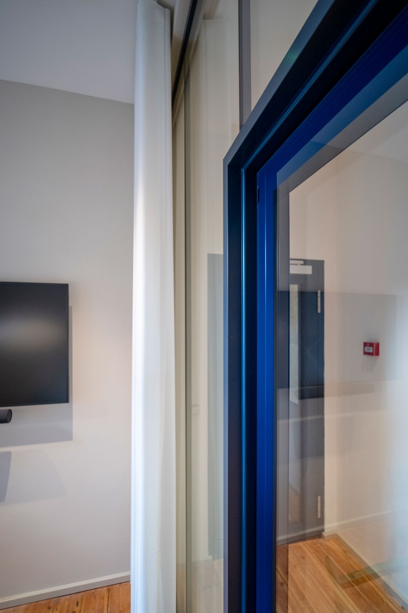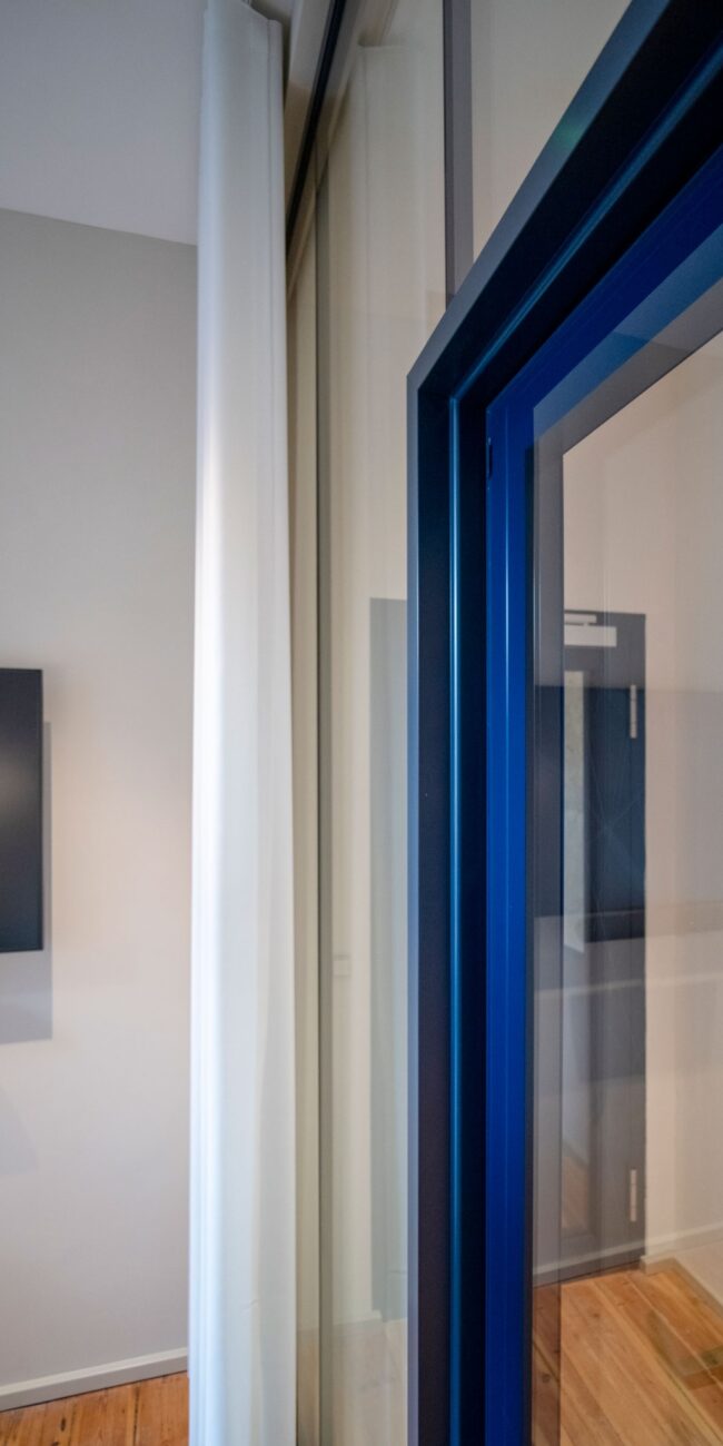 Det er i denne kontekst, at DEKO’s glasvægge og døre indgår som et nutidigt lag. De koboltblå profiler skaber en præcis og kontrolleret kontrast til de varme murstensflader og de eksisterende konstruktioner. Farvevalget understreger, at der er tale om en moderne intervention, men uden at forstyrre helhedsindtrykket. Resultatet er en tydelig aflæsbarhed mellem gammelt og nyt – et princip, der ofte er afgørende i arbejdet med historiske ejendomme.