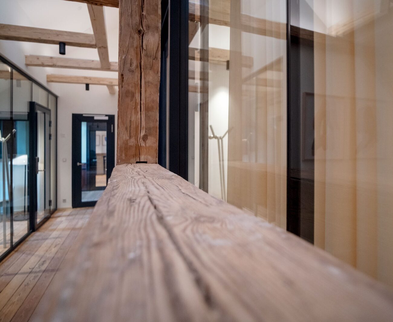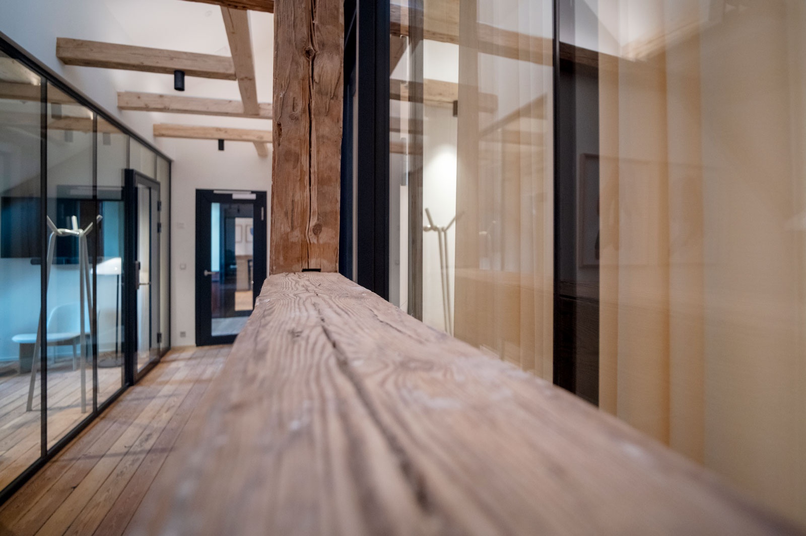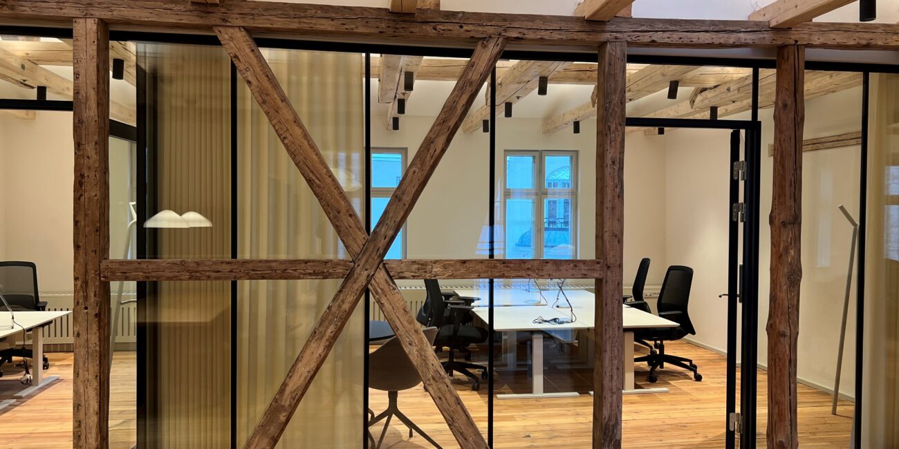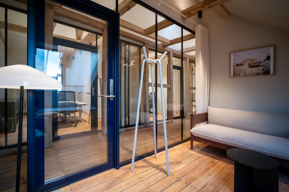 Det er i denne kontekst, at DEKO’s glasvægge og døre indgår som et nutidigt lag. De koboltblå profiler skaber en præcis og kontrolleret kontrast til de varme murstensflader og de eksisterende konstruktioner. Farvevalget understreger, at der er tale om en moderne intervention, men uden at forstyrre helhedsindtrykket. Resultatet er en tydelig aflæsbarhed mellem gammelt og nyt – et princip, der ofte er afgørende i arbejdet med historiske ejendomme.